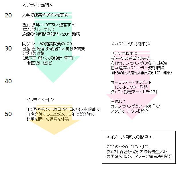 企業で働きながら、30才から、週末はカウンセリングやアートセラピーの学校に通い、心理についての資格取得や技能の研鑽を行って参りました。 デザイン活動の根底にあるものは「人の喜び」を探求することでが、心理学の根底にあるものも、全く同じものだと思っております。